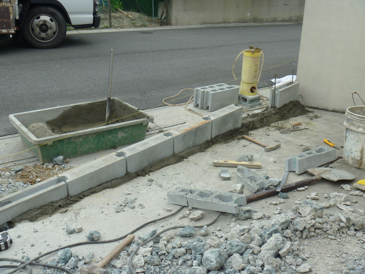 職人さんはブロックを側面に敷いていきます。