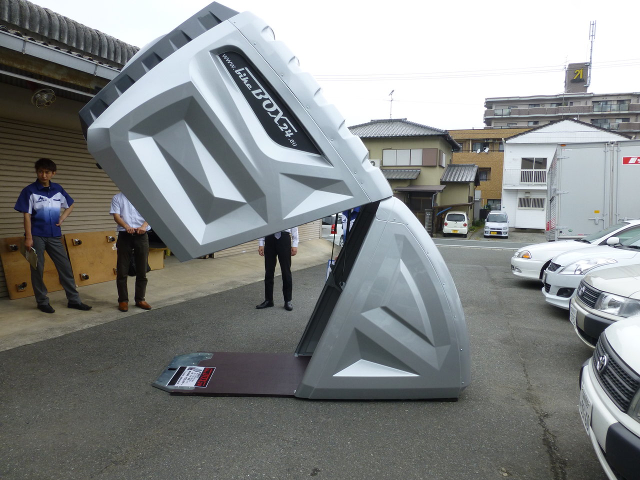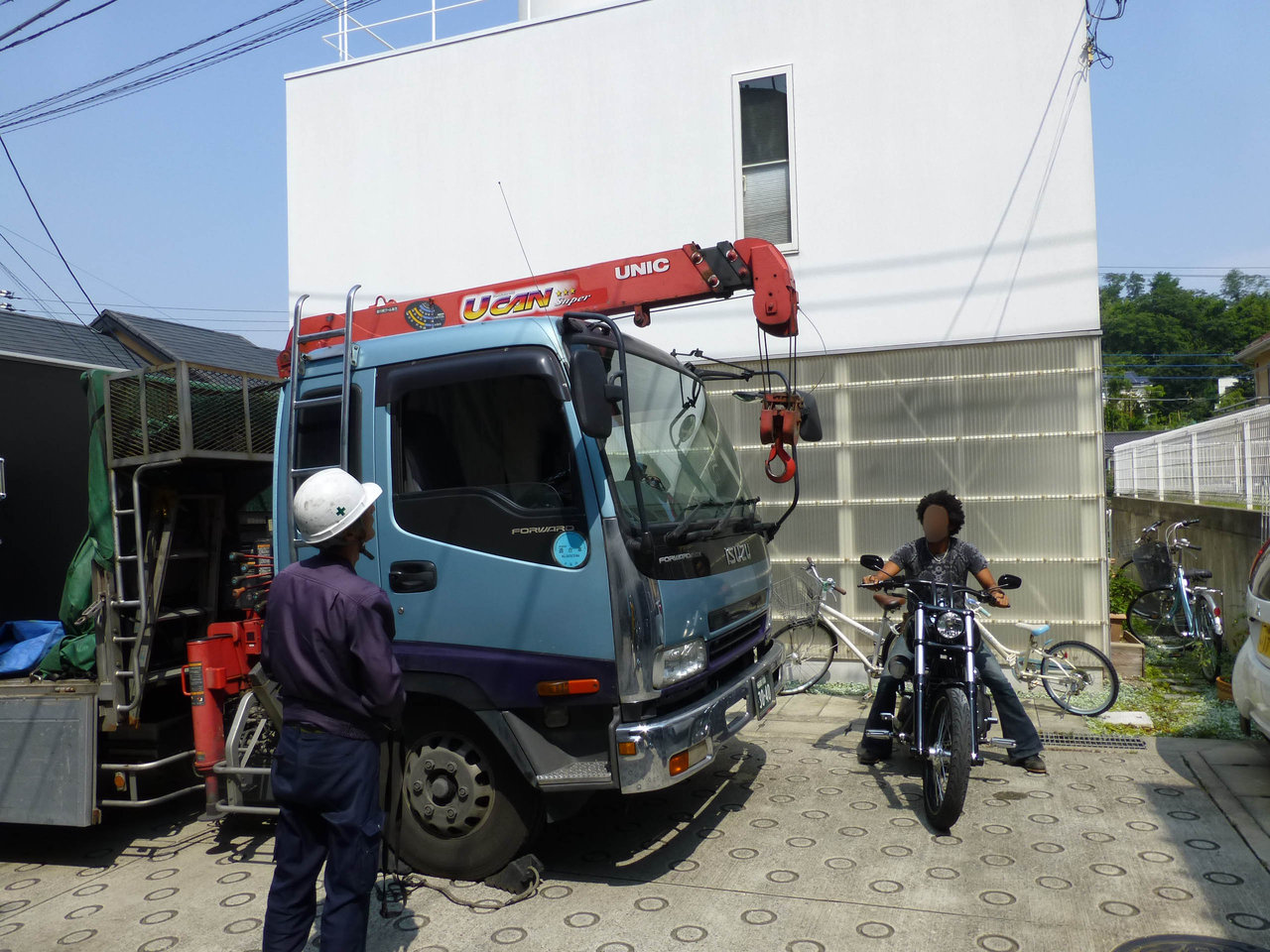 トラックのドライバーさんを後ろでバイクロッカーの方向を調整してもらっています。
