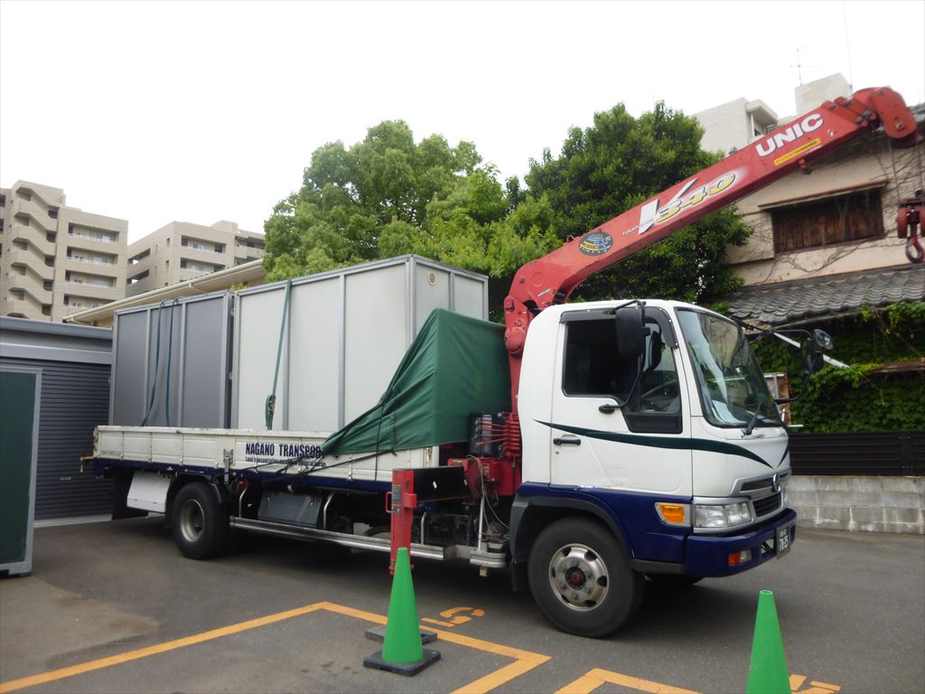 ロゴの入れ込みなのでフォークリフトで吊り上げて塗装しました。