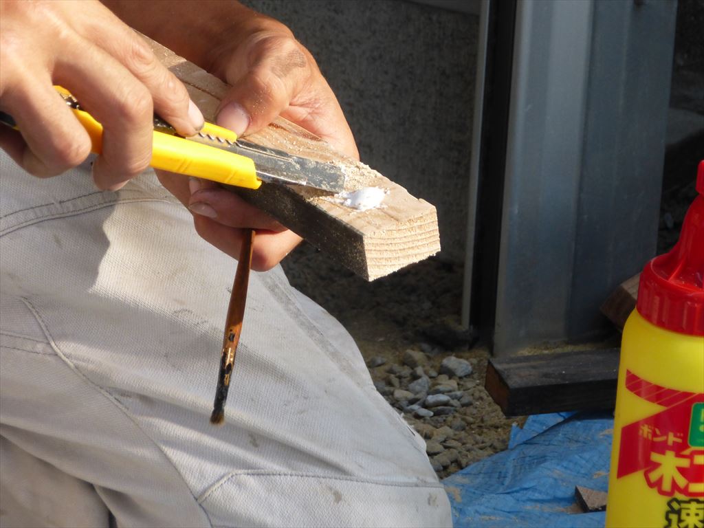 扉と滑り出し窓はガラスなので飛び石の割れを防ぐために養生しました。